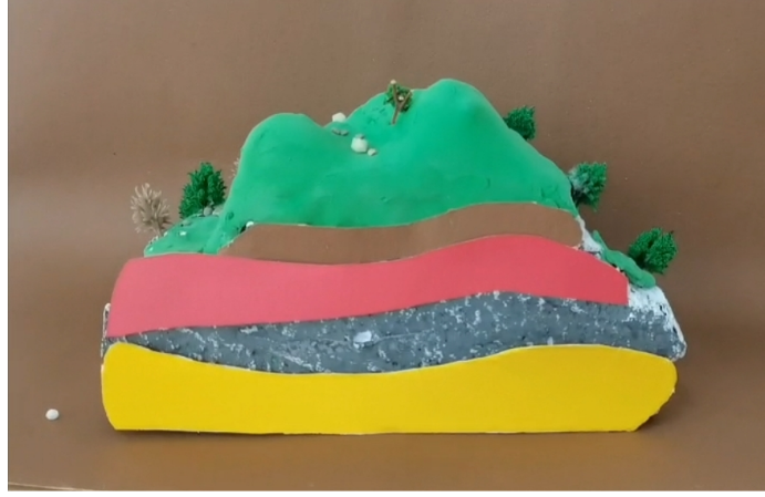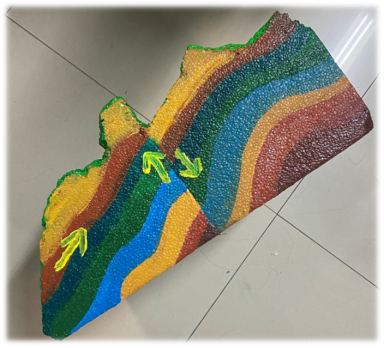 作品简介:作品展示了向斜背斜的褶皱及岩层的变化。用颜色加以区分,从上至下代表了不同地层的岩性。