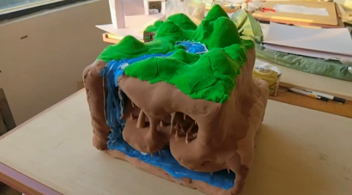 作品简介:模型主体分为地上地下两个部分,采用剖面的形式展示喀斯特地貌在水平方向上分为三个部分,以全面展示喀斯特地貌的整体景观。