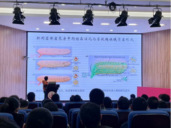 王焰研究员主要从两部分进行分享,首先,王老师为我们介绍了层状岩体岩浆房冷却过程,这一部分王老师为我们讲述了层状岩体岩浆房的概念和物质组成,进而提出一个关键科学问题:岩浆房如何结晶和演化?这一问题激发了我校师生的高度兴趣,王老师以不同程度过冷却和冷却速率下橄榄石和单斜辉石以及进行讲解来分析其冷却过程。其次王老师分析了不同大小的岩浆房的冷却过程和结晶过程,其中小的岩石选取:新街岩体岩浆房与层状超镁铁质岩,大的岩石选取:加拿大sept Iles岩石,用二者进行对比,从而分析出岩石生长与过冷度和冷却速度关系。最后,王老师对关于岩体岩浆房的新发现和挑战传统的认知进行了小结。