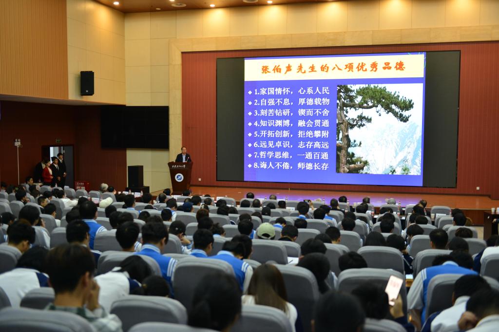 表彰会上,中国科学院院士张国伟教授语重心长地对获奖同学说,学习张伯声精神,就是要刻苦努力,守正创新,勇攀高峰,为国奉献。西安石油大学校长李天太致辞。研究会副秘书长李佐臣教授作了“张伯声地壳波浪状镶嵌构造学说”报告、研究会副理事长李荣西教授作了“张伯声先生简历和优秀品德”报告、研究会副理事长兼秘书长杨兴科教授作了“张伯声基金章程和张伯声奖”报告。长安大学副校长、研究会理事长朱杰君宣读了获奖大学生和研究生名单。张国伟、李天太、刘池阳、朱杰君、刘建朝、梁仕荪、高志亮、杜玉良、齐文、杨贵良等学者专家嘉宾为获得张伯声奖的8位大学生、7位博硕士研究生颁发了获奖证书和奖金,并赠送了《张伯声传》,4位获特等奖学生代表发表了获奖感言,决心弘扬张伯声精神,为我国新时代地学发展作出应有贡献。