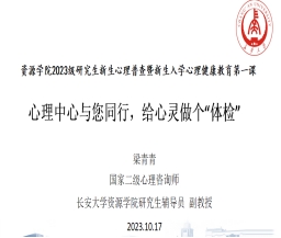 二楼伯声报告厅, 2023级研究生新生集中心理健康普查工作暨心理健康教育第一课-心理中心与您同行,给心灵做个“体检”如期进行。此次的心理测评由国家二级心理咨询师、副教授、太阳城网址
