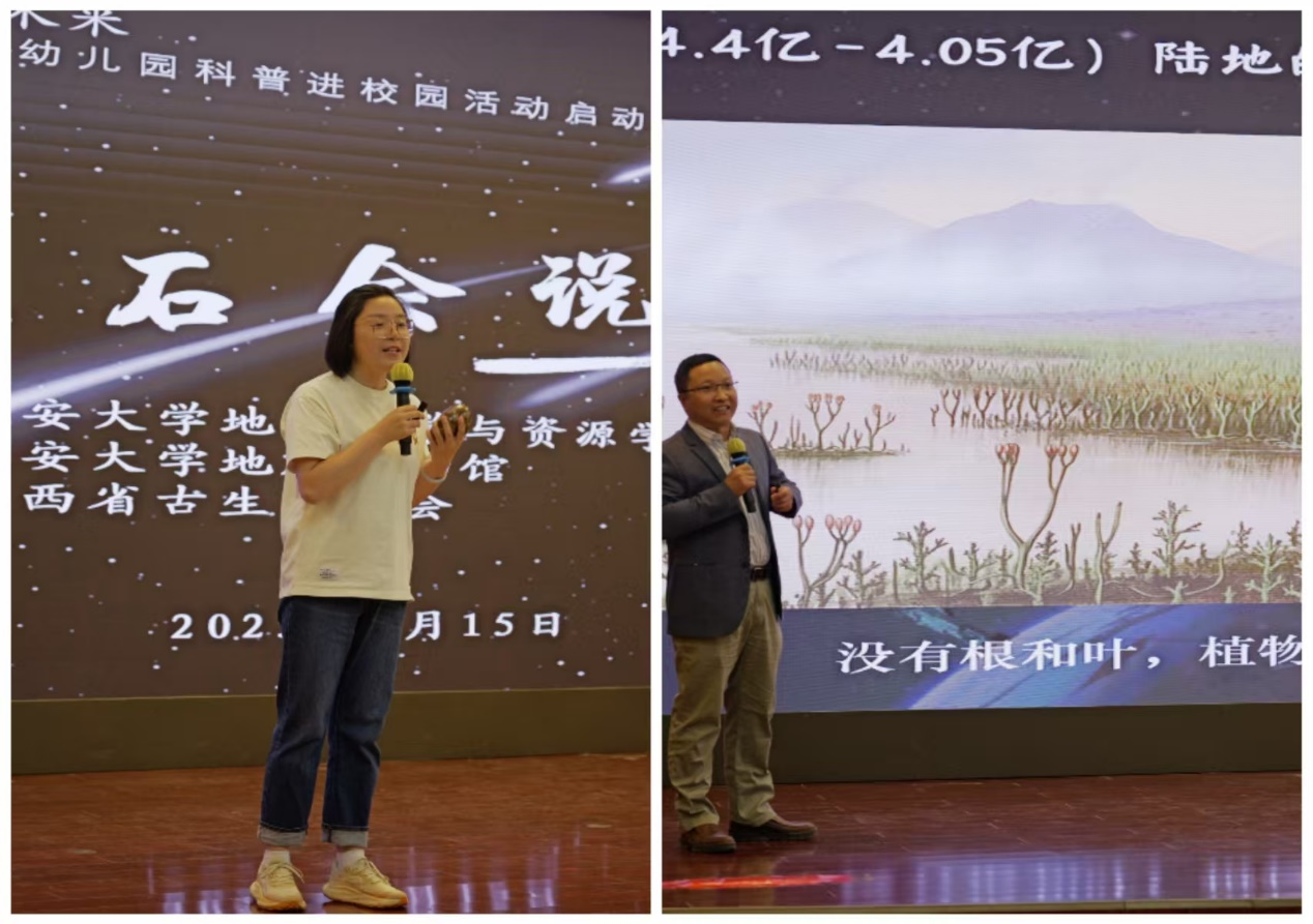 活动现场,长安大学肖良副教授与西北大学白琳部长联袂带来高质量科普讲座《化石会说话》。通过生动的动画演示和化石互动,专家们以“穿越时空”的视角,带领孩子们揭秘远古生物的生活场景,激发了孩子们的浓厚兴趣。