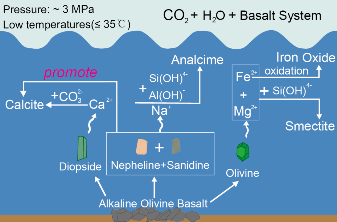 本论文采集了中国主要陆相玄武岩储层中的9件、4种类型的玄武岩样品,并对其进行了一系列水岩反应的实验室研究(见图)。实验结果表明,在较低(≤35℃)的温度条件下,CO2-H2O-玄武岩及CO2-卤水-玄武岩体系中形成的次生碳酸盐矿物,主要以方解石(CaCO3)为主,而非MgCO3或FeCO3。因此,在低温(≤35℃)条件下,相较于富含Mg、Fe的玄武岩,含Ca较高的玄武岩更有利于形成稳定的碳酸盐矿物。此外,在低温(≤35℃)和约3 MPa压力的实验条件下,与其他类型的玄武岩相比,富含钙矿物及典型碱性矿物(霞石和Na-透长石)的碱性橄榄玄武岩,其反应后溶液中的pH值最高,且反应产物中具有最高的方解石含量。因此,在低温(≤35℃)条件下,碱性矿物霞石及Na-透长石作为反应溶液中的pH缓冲剂,增加了CO2-H2O-玄武岩反应体系的pH值,并促进了方解石的沉淀。此外,研究结果表明在相同的实验条件下,来自山东临朐-昌乐火山盆地的新生代碱性橄榄玄武岩具有最高的碳矿化速率。因此,山东临朐-昌乐火山盆地可作为中国原位(in-situ)碳封存最有前景的玄武岩储层之一。对于非原位(ex-situ)的海洋碳封存,与目前大量使用的橄榄石相比,透辉石或Ca-长石可能更适合撒播到海洋中来实现海洋负排放。