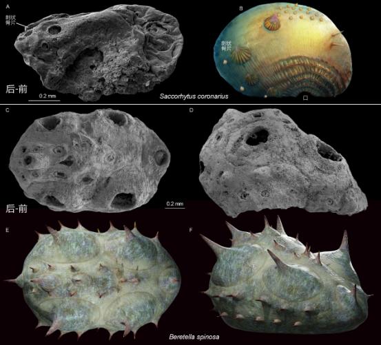 图2.寒武纪幸运期的皱囊虫(A-B)和寒武纪第二期的贝雷虫(C-F)。A-B,侧视及其复原图。C,E,俯视及其复原图。D,F,侧视及其复原图。