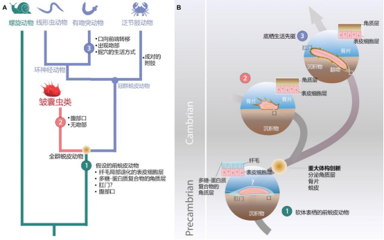 图3.皱囊虫类的系统发育位置(A)及其可能的演化过程(B)。