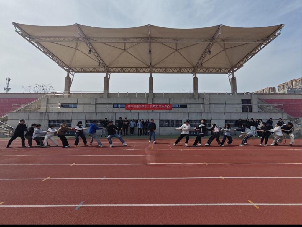 在北校区西区操场举行“强身健体手拉手·民族团结心连心”之民族学生拔河友谊比赛,学院党委副书记许晨、团委书记巩昌盛、兼职辅导员王乐和五支参赛队伍参加比赛。